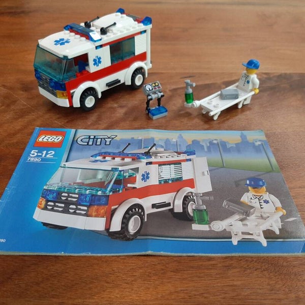 Lego City 7890 Ambulance. Helemaal compleet en inclusief de originele bouwinstructies. Kwaliteit van de Lego: 8/10 (mondje van ambulancemewerker een beetje afgesleten), kwaliteit van de stickers: 8/10 (twee stickers ontbreken op de ramen, één sticker is verkeerd geplakt), kwaliteit van de instructies: 8/10 (ezelsoortje)