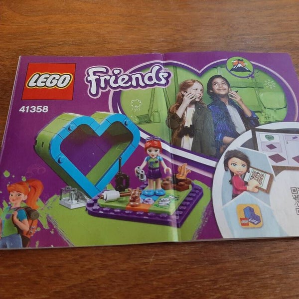 Lego Friends 41358 Mia's Heart Box. In het hartvormige doosje, dat je zelf bouwt van Lego, passen alle overige onderdelen. Helemaal compleet en inclusief de originele bouwinstructies. Kwaliteit van de Lego: 9/10, kwaliteit van de instructies: 9/10.