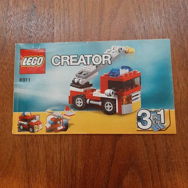 Lego Creator 3in1 6911 Mini Fire Rescue. Een 3 in 1 setje waarmee je een brandweer ladderwagen, comandowagen of helikopter kunt bouwen. Helemaal compleet en inclusief de originele bouwinstructies. Kwaliteit van de Lego: 9/10, kwaliteit van de instructies: 7/10 (kleine scheurtjes en kreukels in de kaft).