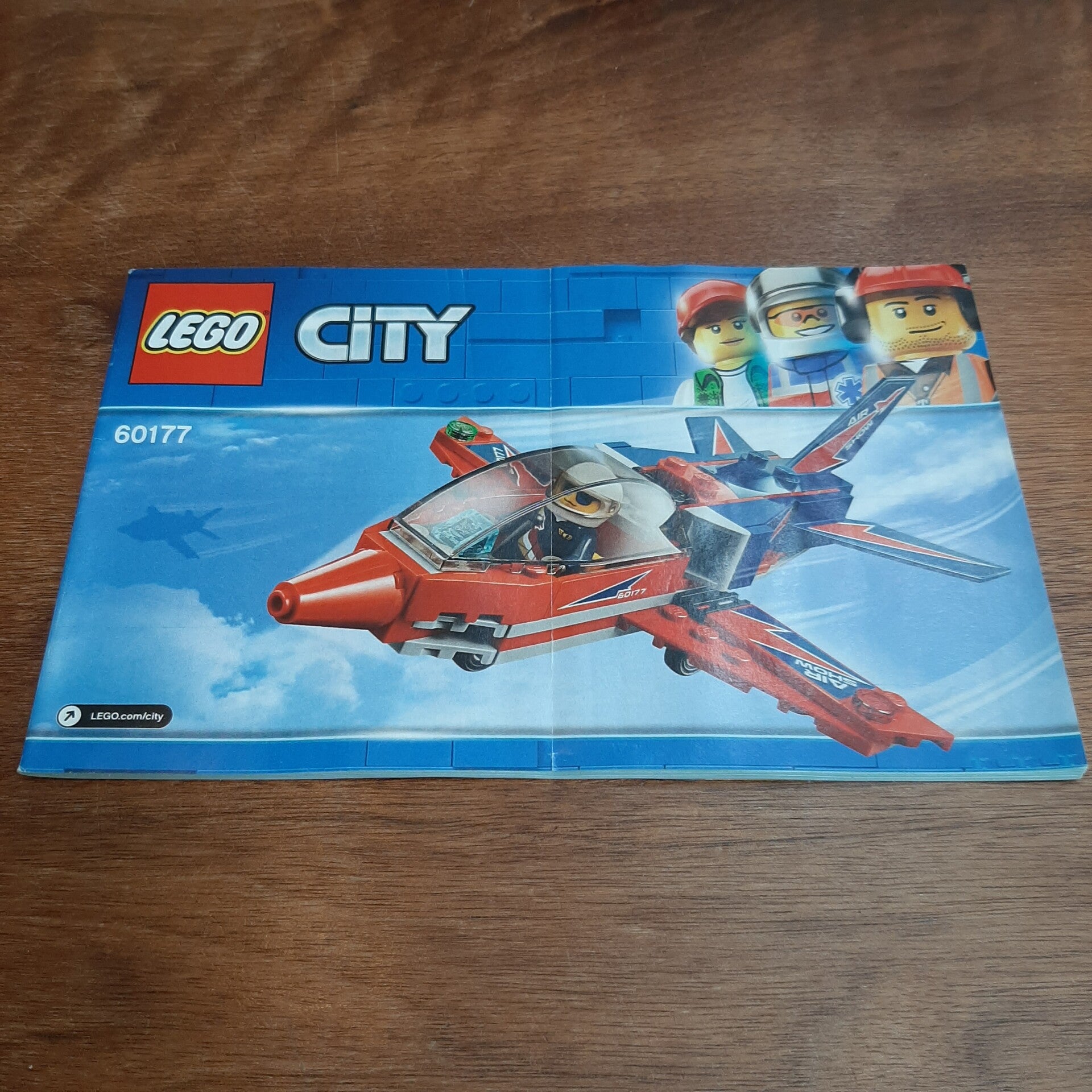 Lego City 60177 Airshow Jet. Set uit 2018 met 82 onderdelen en één minifiguur. Helemaal compleet en inclusief de originele bouwinstructies. Kwaliteit van de Lego: 9/10, kwaliteit van de instructies: 9/10, kwaliteit van de stickers: 8/10.