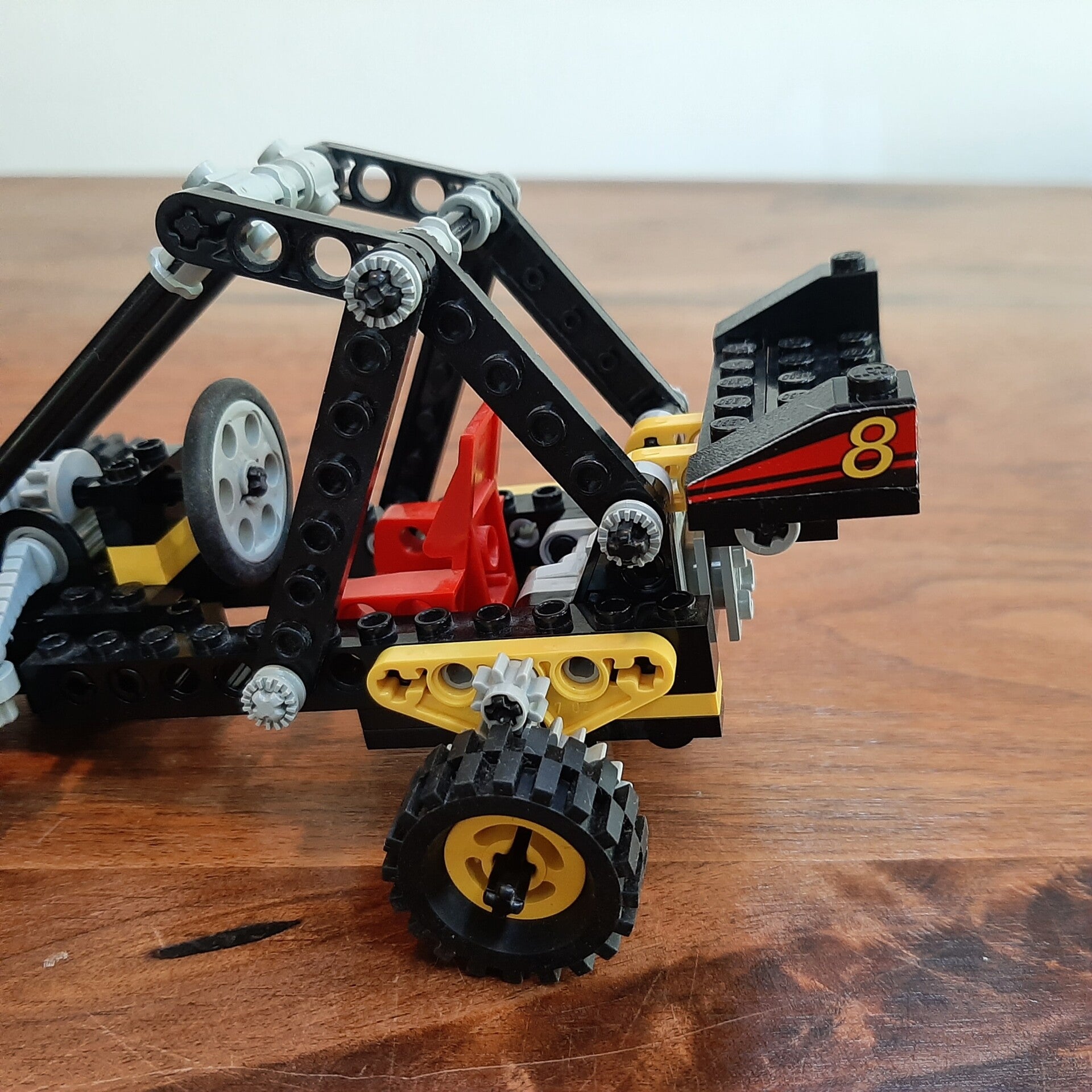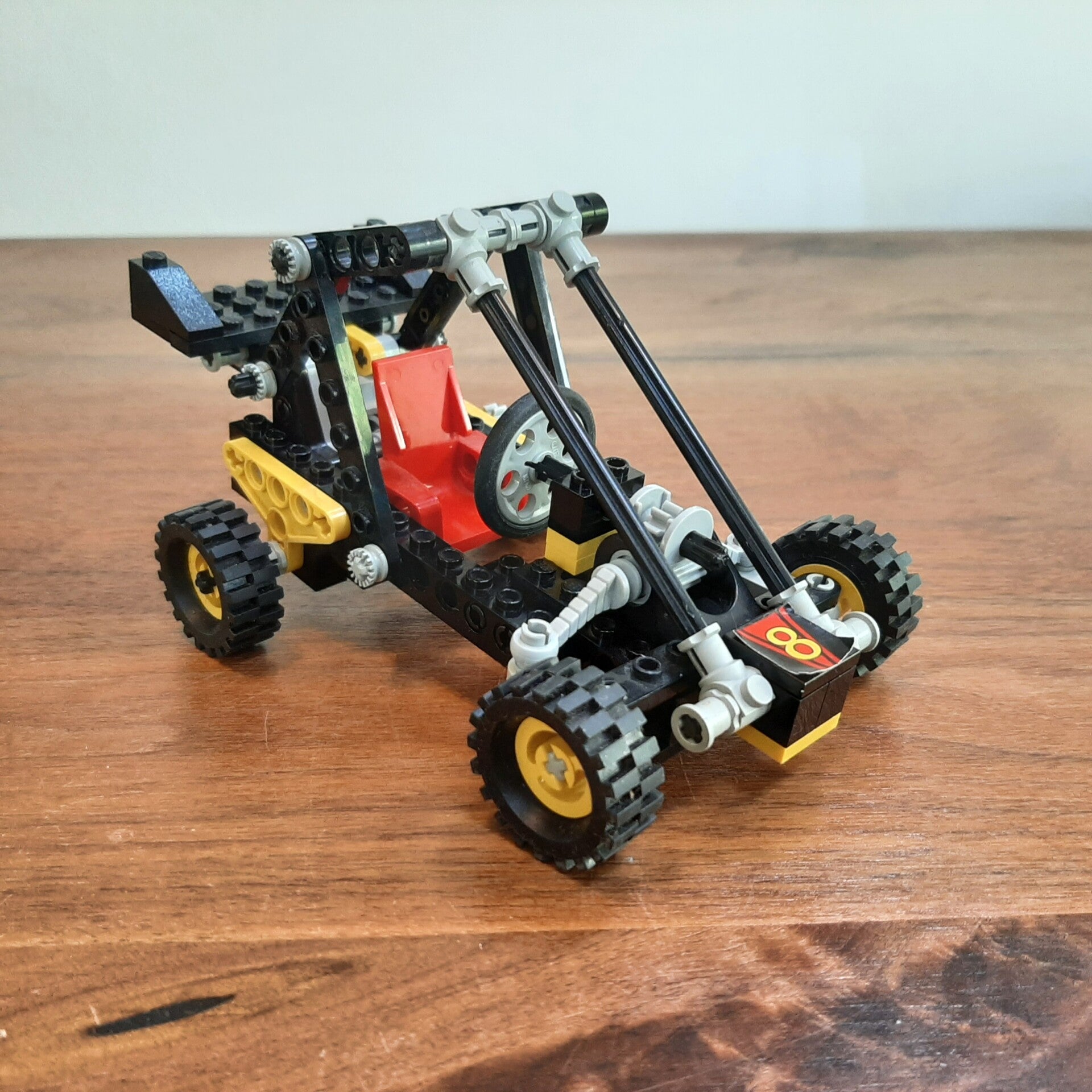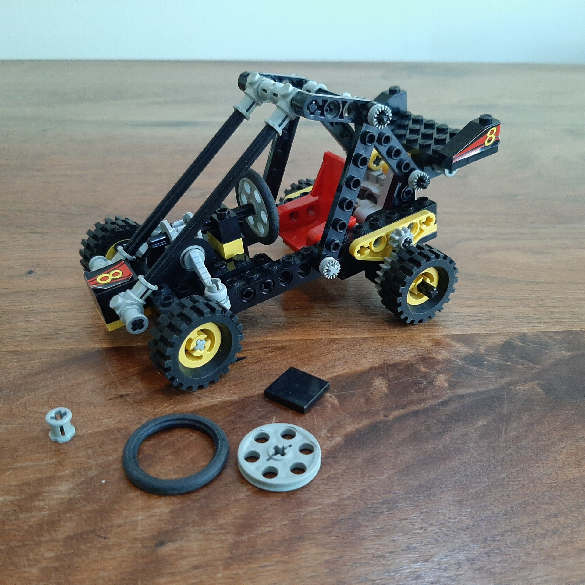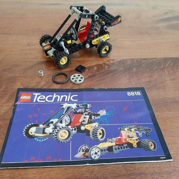 Lego Technic 8818 Baja Blaster / Desert Racer. Set uit 1993 met 120 onderdelen. De voorwielen draaien bij het sturen en de zuiger beweegt tijdens het rijden. Helaal compleet en inclusief de originele bouwinstructies. Kwaliteit van de Lego: 8/10 (prima voor de leeftijd van de set), kwaliteit van de instructies: 9/10, kwaliteit van de stickers: 6/10 (1 sticker is afwezig, de twee andere laten los).