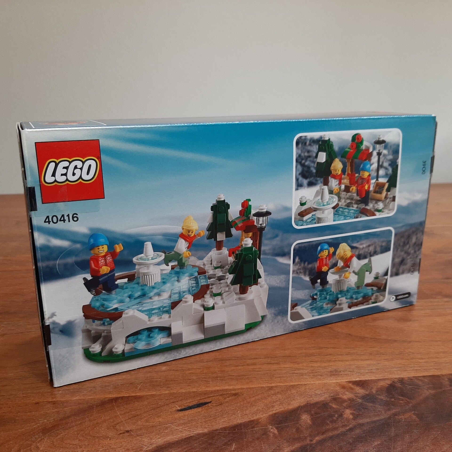 Lego Holiday & Event Christmas 40416 Ice Skating Rink. Mooie set uit 2020 met 295 onderdelen en 2 minifiguren die bewegen als je aan de zijkant aan een tandwiel draait. Helemaal compleet en inclusief de originele bouwinstructies en doos. Kwaliteit van de Lego: 10/10 (alleen gebouwd, niet mee gespeeld), kwaliteit van de instructies: 10/10, kwaliteit van de doos: 9/10 (een hoekje is heel licht beschadigd).