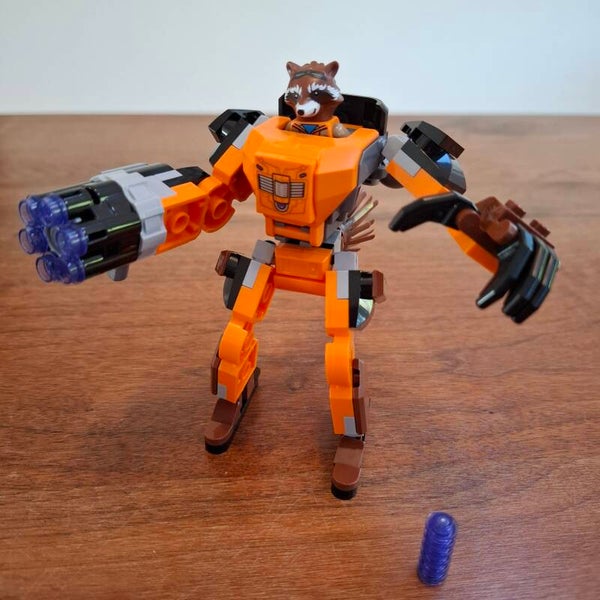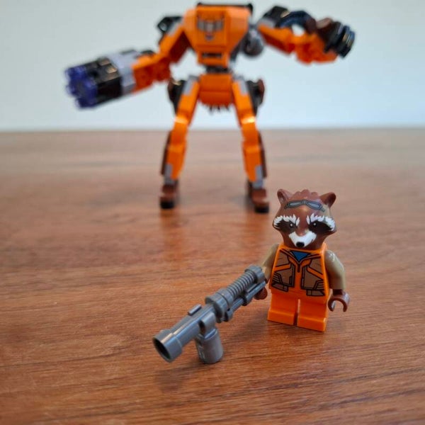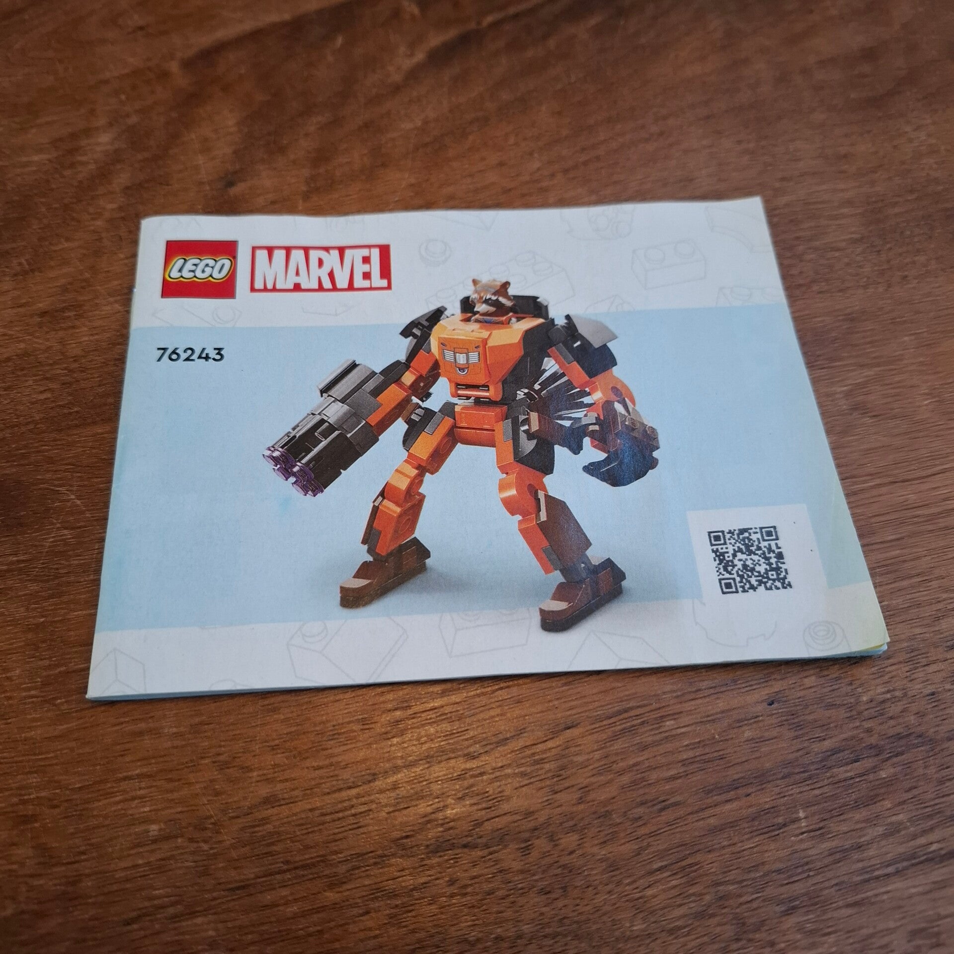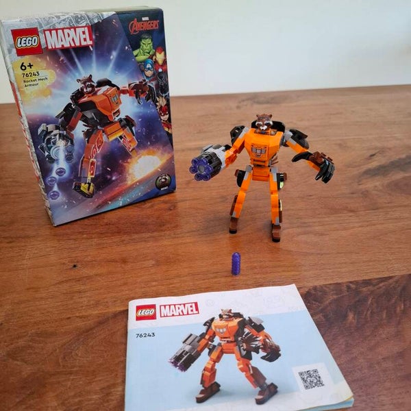 Lego Super Heroes: Avengers 76243 Rocket Mech Armor. Set uit 2023 met 95 onderdelen en 1 minifguur. Alleen gebouwd, er is niet mee gespeeld. Helemaal compleet en inclusief de originele bouwinstructies en doos. Kwaliteit van de Lego: 10/10, kwaliteit van de instructies: 9/10 (ezelsoortje), kwaliteit van de doos: 8/10.