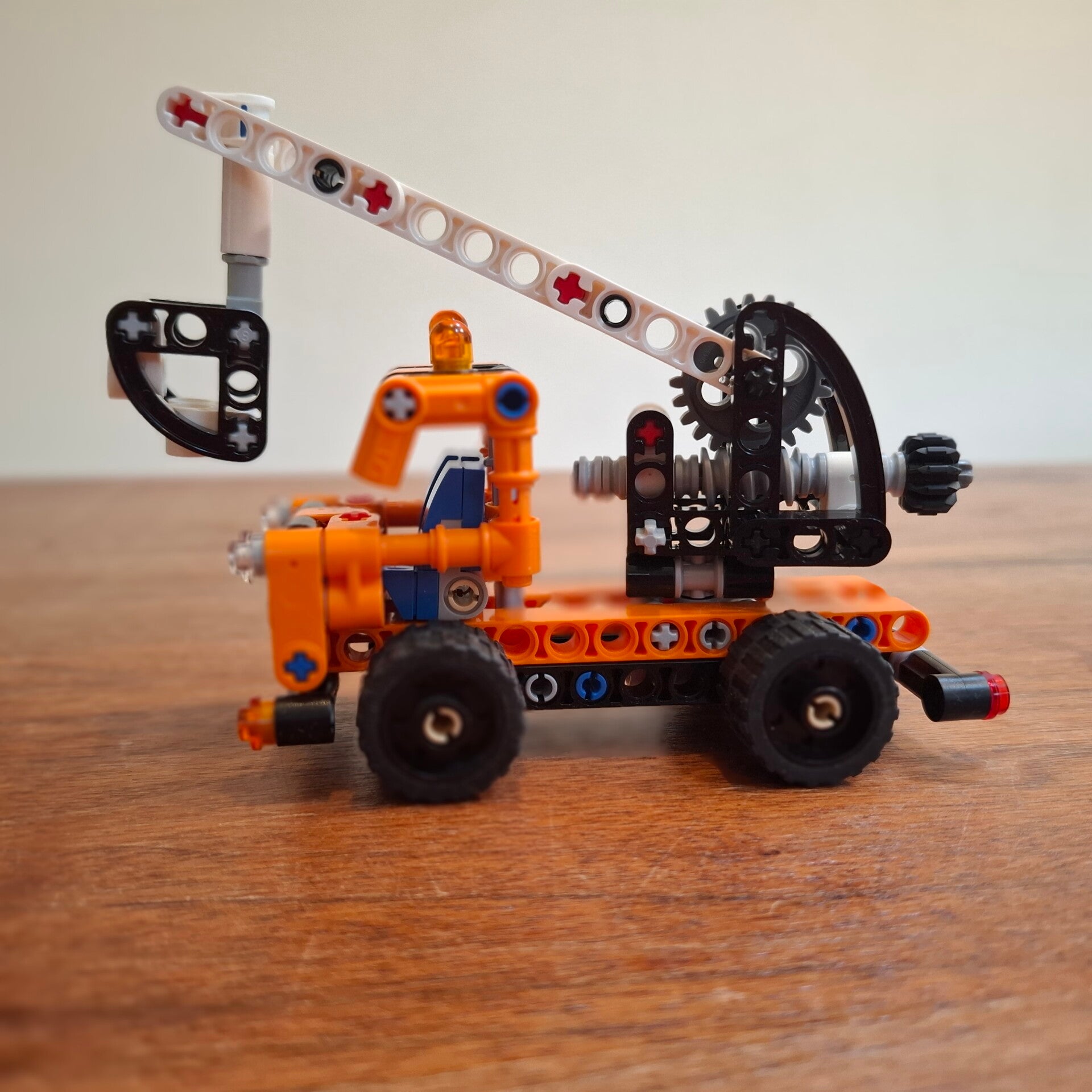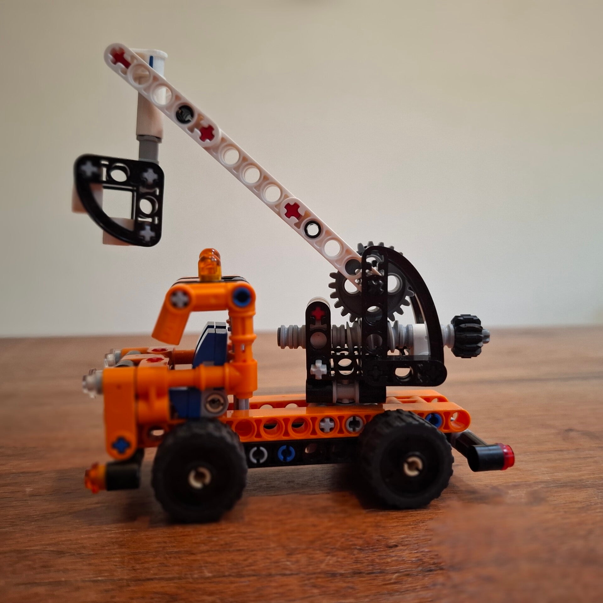 Lego Technic 42088 Cherry Picker. Set uit 2019 met 155 onderdelen. Kan als hoogwerker of als sleepwagen gebouwd worden. Helemaal compleet, maar zonder bouwinstructies. Kwaliteit van de Lego: 9/10.