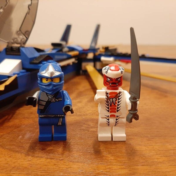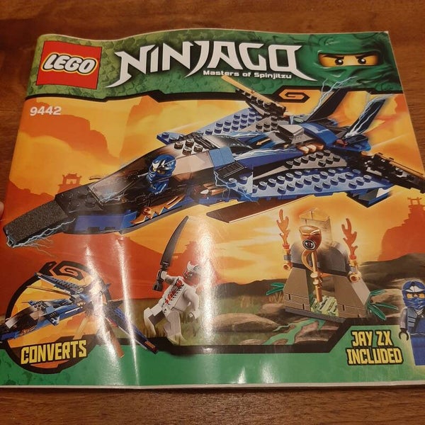 Lego Ninjago 9442 Jay's Storm Fighter. Set van de serie Ninjago: Rise of the Snakes. Helemaal compleet en inclusief de originele bouwinstructies. Kwaliteit lego: 9/10, kwaliteit boekje: 9/10 (helemaal heel, maar er zit een vouw in).