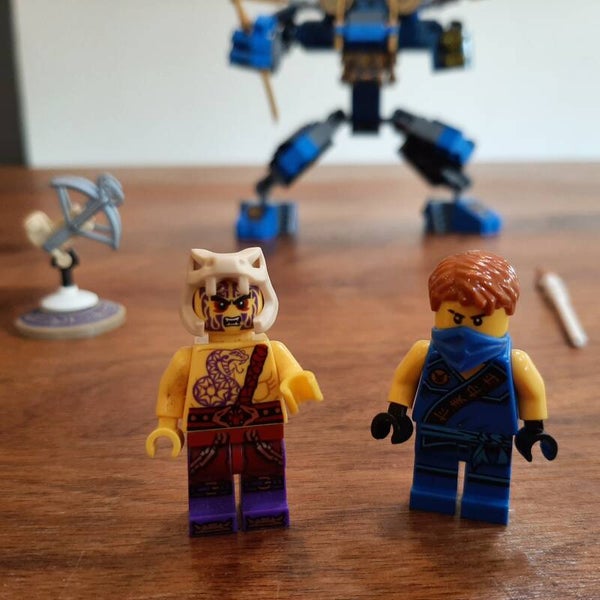 Lego Ninjago 70754 Electro Mech. Set van de serie Ninjago: Tournament of Elements. Helemaal compleet en inclusief de originele bouwinstructies. Ook alle stickers zitten erop. Kwaliteit Lego: 9/10, kwaliteit boekje: 8/10 (kleine scheurtjes en lichte vouwen), kwaliteit stickers: 8/10 (soms een beetje scheef).