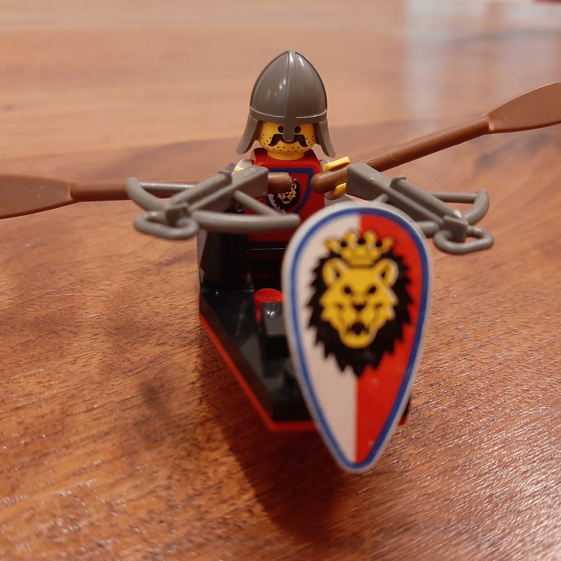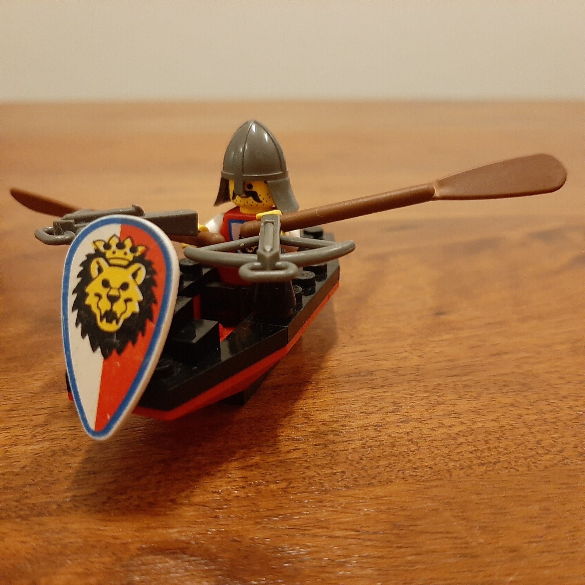 Lego Castle 1752 Boat with Armor. Compleet setje van de Royal Knights serie, maar zonder bouwinstructies. Kleine bend marks in de roeispanen (zie foto's). Kwaliteit van de Lego: 7/10.