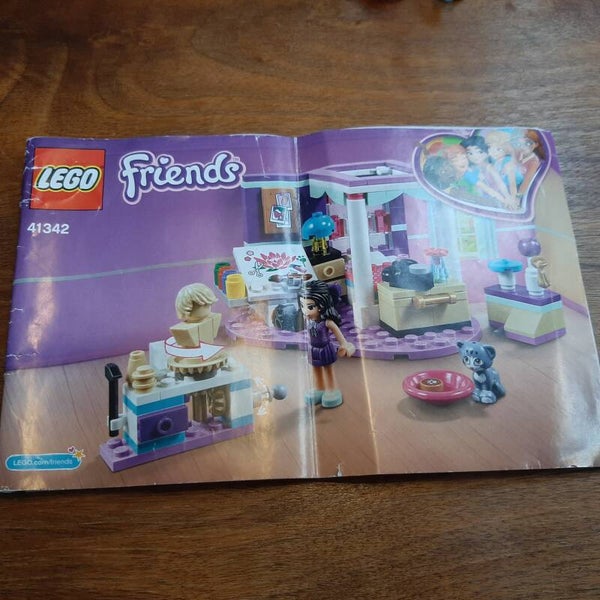 Lego Friends 41342 Emma's Deluxe Bedroom. Helemaal compleet en inclusief de originele bouwinstructies en doos. Kwaliteit van de Lego: 9/10, Kwaliteit van het boekje: 7/10 (vouw en kreukels), Kwaliteit van de doos: 6/10 (aan de achterzijde is een stukje van de afbeelding afgescheurd, zie foto), kwaliteit van de stickers: 9/10.
