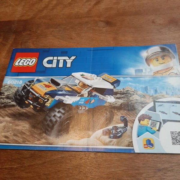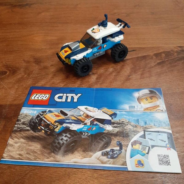 Lego City 60218 Desert Rally Racer. Helemaal compleet en inclusief de originele bouwinstructies. Kwaliteit van de Lego: 9/10, kwaliteit van de instructies: 9/10 (ezelsoor), kwaliteit van de stickers: 8/10 (alemaal aanwezig, maar soms wat scheef geplakt).