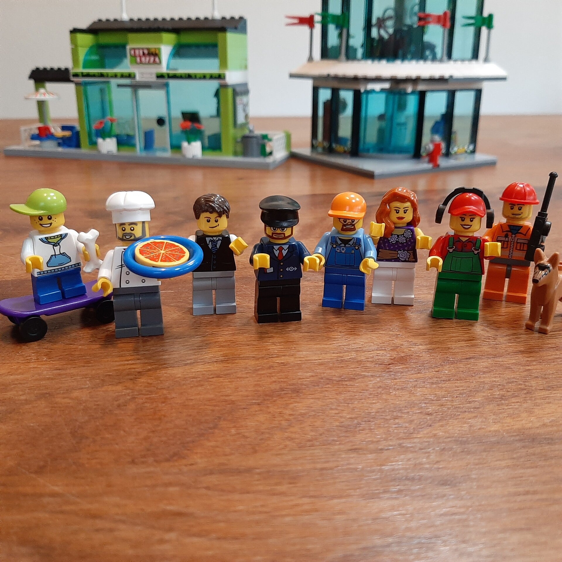 Lego City 60026 Town Square. Helemaal compleet en inclusief de originele bouwinstructies. Het touwtje voor de hijskraan is nog ongebruikt en zit nog in het originele kartonnetje. Mooie en zeer uitgebreide set met fietsenwinkel, pizzeria, hijskraan, standbeeld, bus en bushalte, straatveger en 9 minifiguren. Kwaliteit van de Lego: 9/10, kwaliteit van de instructies: 9/10 (boekje 3 heeft een vouw in de kaft), kwaliteit van de stickers: 8/10 (nummerbord van de bus zit scheef).