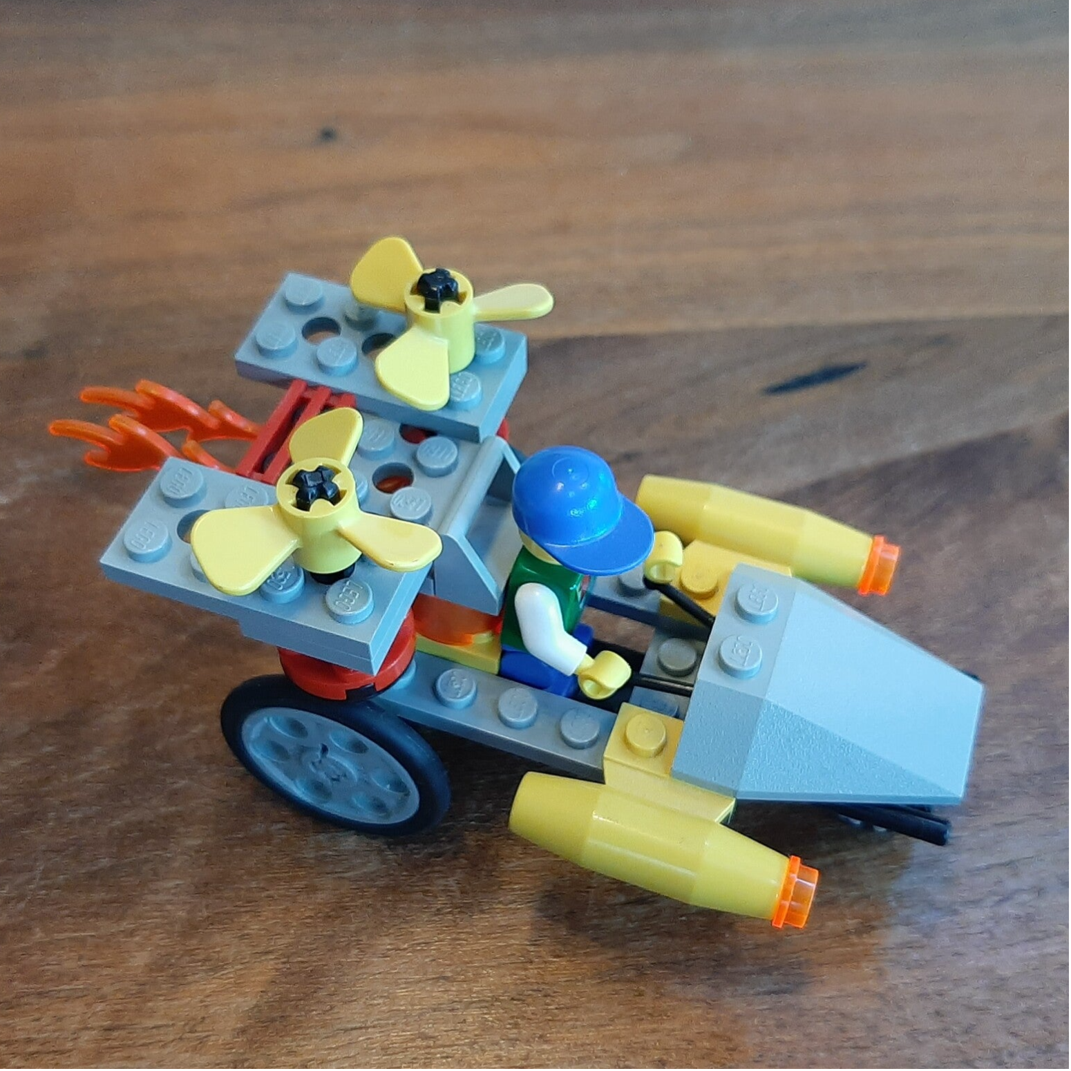 Lego Time Cruisers/Twisters 6491 Rocket Racer. De propellors draaien tidenshet rijden. Helemaal compleet en inclusief de originele bouwinstructies. Kwaliteit van de Lego: 8/10 (het velgje van het voorwieltje is wat minder netjes), kwaliteit van de instructies: 8/10 (hele kleine scheurtjes).