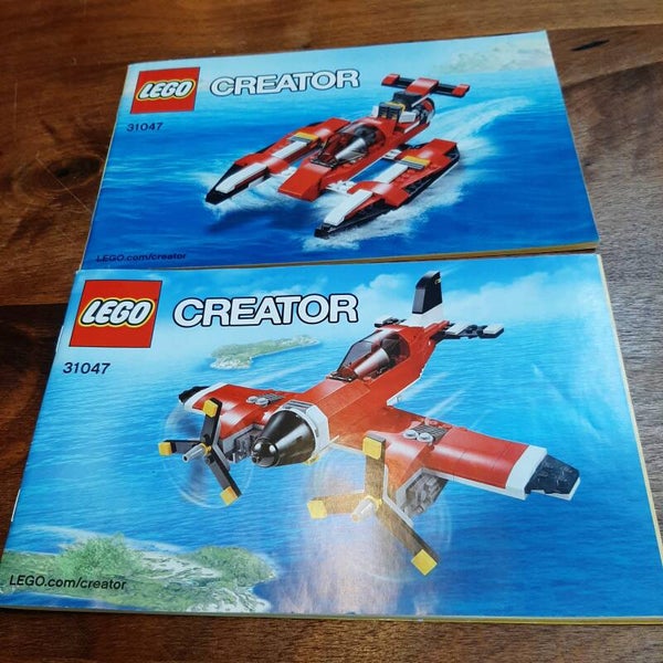 Lego Creator 31047 Propeller Plane. Mooie 3-in-1 set die gebouwd kan worden als vliegtuig, helikopter of speedboot. Helemaal compleet en inclusief de drie boekjes met originele bouwinstructies. Kwaliteit van de Lego: 9/10, kwaliteit van de instructies: 9/10.
